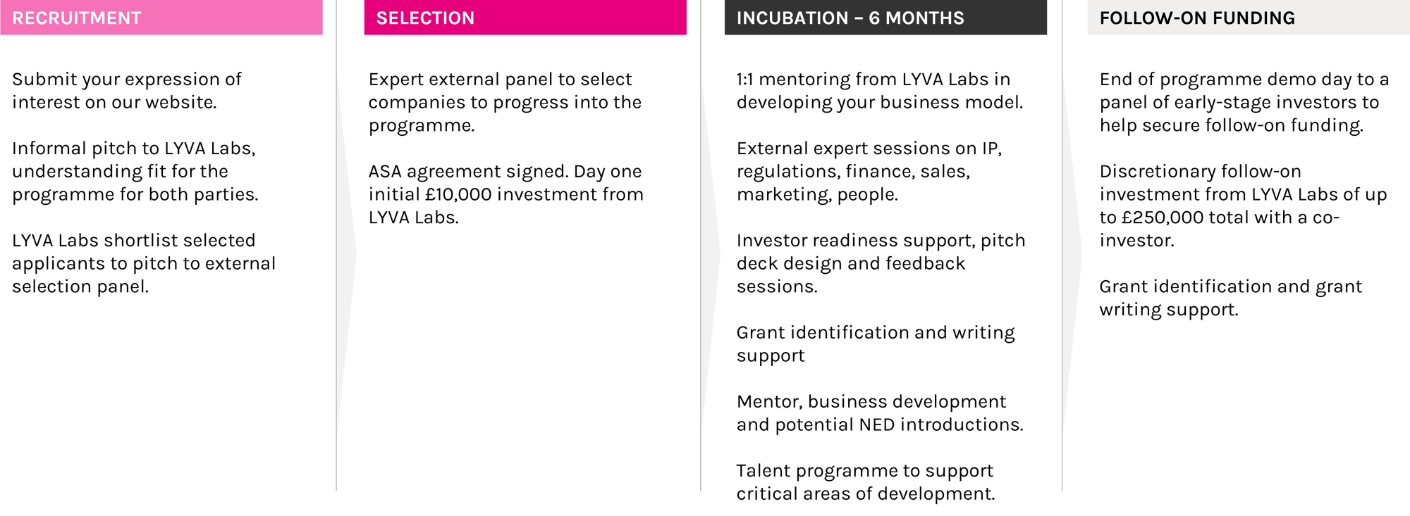 LYVA Labs incubator provides early-stage Liverpool City Region based businesses in deep tech, health & life science, and clean tech for health sectors with a tailored investment support programme, including £10K investment on day one, 1:1 mentoring, grant writing support, cohort learning sessions and an investor demo day to help secure follow-on investment.